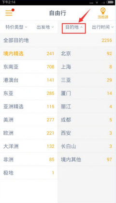 4、点击目地地,用户即可以根据目的地选择旅游线路哦,而且里面还包括很多特价哦。