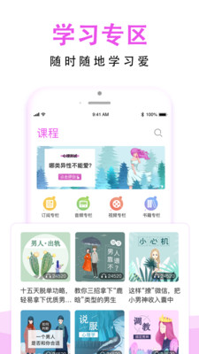 超过500万人使用,帮助单身男女解决如何找到另一半,追到喜欢的TA,挽救破裂的婚姻、爱情,以及如何聊天、约会恋爱、搭讪表白等情感问题。高质量情感资源,实现女性终生自我提升。
