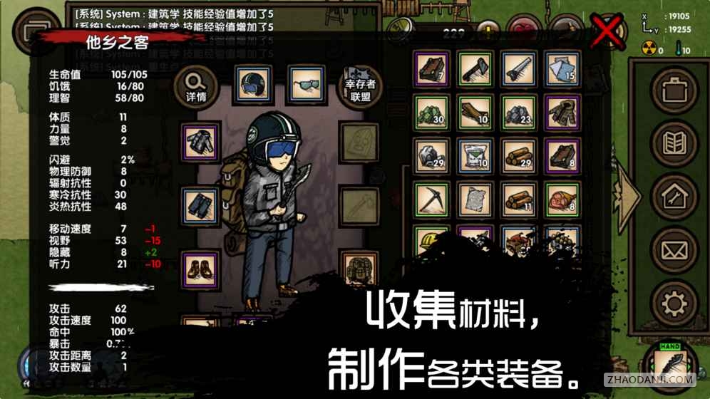 进入游戏后,可以先在附近走走,熟悉环境,同时在路上采集遇到的木材、石头还有野果。出生点附近的怪物都不是很厉害,但前期最好优先击杀丧尸,因为丧尸有机率掉落装备。