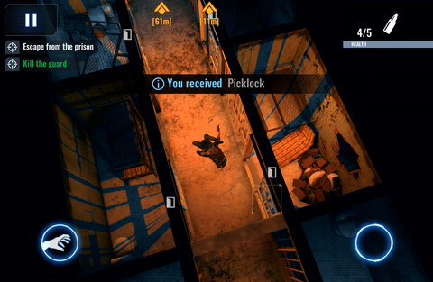 游戏中的操作还是非常简单的,双摇杆的控制方式让玩家可以轻松的对我们的主角进行操控,要知道在潜入类游戏中对于操作的准确度要求还是比较高的,稍有不慎就会被敌人发现,最后导致任务失败。左摇杆负责控制角色的移动,而右摇杆则负责攻击。游戏中的武器系统还是非常丰富的,当然了在枪械上会有消声器,不然一开枪就有可能被发现,而另外还有烟雾弹、闪光弹等等配件,善于利用这些武器可以让玩家在面对敌人的时候能够悄无声息的将他们击倒。